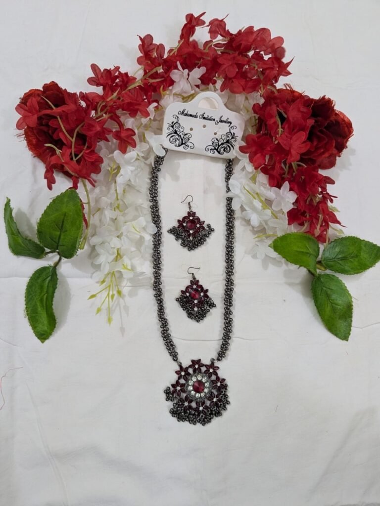 Stone Work Black Silver Metal Long Necklace Set With Kundon For Women/ Jewellery Set